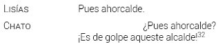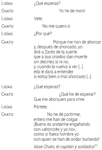 A veces los graciosos enuncian comentarios ingeniosos no solo sobre sus sanciones sino también sobre quien las profiere. Es decir, se burlan del castigo y del castigador31. Por ejemplo, antes del diálogo en el que Chato insistía en morir ahorcado, se había dirigido de este modo a Lisías: