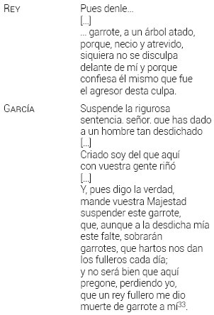 García se sirve del doble significado de «garrote» como forma de ejecución y como un tipo de trampa que cometían los fulleros, término con que se conocía a los jugadores de naipes que engañaban a sus rivales y utilizaban cartas y dados falsos. Un rey que da garrotes es, según la lógica del gracioso, un rey fullero34. Después de esta intervención, el monarca pregunta: «¿Si este es loco?», a lo que responde uno de sus hombres, Íñigo, «No lo dudo». El gracioso le pide que lo deje ir libre, lo que el Rey permite con un escueto «Libre estás»35. Solo a estos «locos» se les consiente una incorrección de tal índole ante sus superiores, incluido el Rey, ya que poseen «absoluta libertad de palabra que a menudo roza la licencia de profanar y burlarse de cualquier categoría o estamento, desde hombres hasta divinidades, pasando por personalidades públicas y políticas, instituciones y corrientes de pensamiento»36.