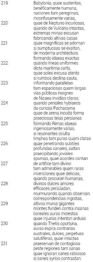 El canto XVI se centra en la importancia del temple, entendido como temperamento del tiempo y clima (vv. 219-234). En primer lugar, Valdés busca términos de comparación para poder describir la belleza de Lima. La compara con Babilonia, la famosa ciudad célebre por sus muros, jardines colgantes, edificios y obeliscos. En el Siglo de Oro, se designan con este nombre grandes ciudades, a menudo (pero no necesariamente) subrayando su tráfago y confusión. No es el caso de los elogios como este de Lima, donde alude a la grandeza de la ciudad.