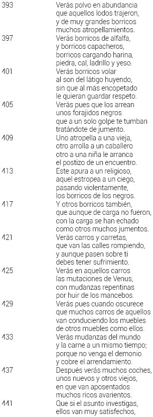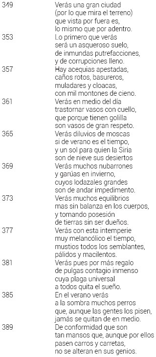 Vemos luego cómo pasa de lo general y político a lo específico cotidiano: las plagas de pulgas que aquejaban a quienes vivían en la época, probablemente por las bajas condiciones de salubridad, la cantidad de perros callejeros y los animales empleados para el transporte a los que Terralla se refiere en los versos transcritos (vv. 385-391). A esto deben agregarse las epidemias que asolaron los territorios americanos desde el inicio de la conquista que, en un primer momento diezman a la población: la gripe, la viruela, el sarampión, la sífilis, el tifus exantemático, la fiebre amarilla y otras que están descritas en las crónicas de indias e informes y memoriales de las autoridades virreinales27.