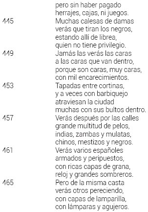 Finalmente, en el fragmento elegido, se refiere —siempre en términos satíricos— al mundo cosmopolita que se encuentra en Lima, donde se ven a españoles ricos y pobres, a criollos, a chinos, a negros. De modo general, la legislación indiana y la literatura jurídica de los siglos XVI, XVII y XVIII distinguían entre «naturales», «vecinos» y «extranjeros»: «la afirmación del derecho natural de toda persona, española o extranjera, a emigrar, adquirir la condición de vecino, y por lo tanto de natural, tuvo la excepción a partir del siglo XVI de que los que quisieran instalarse en los dominios de España tenían que ser católicos. Esto se justificaba porque los no católicos, como seres humanos, gozaban del derecho de inmigración, pero por su fe religiosa, no podían integrarse en la comunidad. Podían ser residentes, pero no vecinos ni naturales»29. Sin embargo, el movimiento económico de los reinos del Perú atrajo a gente de diferentes nacionalidades y credos y la norma vigente no se cumplió, tanto es así, que en repetidas oportunidades se pidió a los virreyes que censaran a los extranjeros y las autoridades encargadas aducían que era una actividad muy difícil tal como lo atestigua el fragmento que sigue: