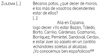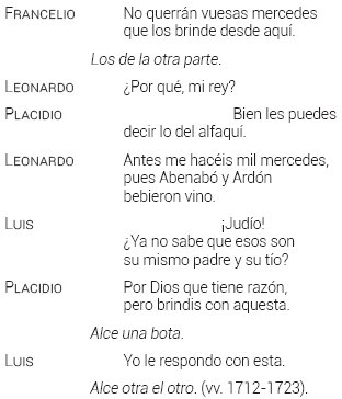 Se trata de versos complejos que solo Usandizaga se ha detenido a comentar con cierto detalle87. Francelio y Placidio pertenecen al grupo cristiano viejo; Leonardo y Luis, al morisco, pero parece darse a entender que son intercambiables, o bien que en el fondo son lo mismo. Al mentar Leonardo a Abenabó, uno de los líderes de la revuelta de las Alpujarras (Lope también parece tener por tal a Ardón), la pregunta que Luis parece dirigir a Placidio («¿Ya no sabe que esos [Abenabó y Ardón] son / su mismo padre y su tío?») podría ser una fanfarronada para emparentar a Leonardo, que los mencionó, con esos dos líderes moriscos, pero también podría entenderse que Luis sugiere que son el padre y el tío del mismo Placidio, y de ahí que este conteste «Por Dios que tiene razón», como reconociéndose también descendiente de los citados líderes moriscos, respuesta que tendría menos sentido en el otro caso. Como recuerda Usandizaga, en Los esclavos libres el gracioso Zulemilla dirige estas palabras a los pajes del virrey de Nápoles, que están difamando a Mahoma: