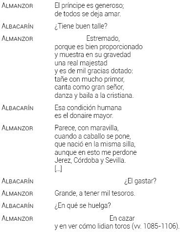 Como se puede apreciar, el príncipe, de buen talle, gusta de cantar y bailar, de la caza y de los toros. Es, en suma, un perfecto cortesano25, pero está lejos de ser un intelectual, y tampoco se mencionan sus actitudes religiosas26, frente a lo que sucede con el Mahomet calderoniano. Y esto se notará en su proceso de conversión. Lope desliza ya que «danza y baila a la cristiana» (v. 1094), y serán estos aspectos los que vayan haciendo mella en su alma.