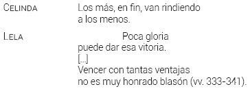 En el motivo insistirá el propio Jeque en la segunda jornada: «Cien mil vencer quince mil / parece vitoria vil» (vv. 1142-1143), y poco después Albacarín, en su relato de la batalla: «Al fin la gran multitud / que como granizo cae / venció, y no por el valor, / que no es razón que se alabe» (vv. 1289-1292). La lógica conclusión que se puede extraer de esto la expone el mismo Albacarín, dirigiéndose al Jeque: