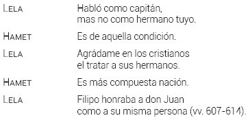 Pero también se destacan otras virtudes de los cristianos. Así, en otra conversación entre dos personajes musulmanes, de nuevo Lela y su amado Hamet, hermano del rey de Marruecos, se presenta a este como de fiera y guerrera condición, pues censura a su hermano por haberse puesto la guirnalda de flores que le ha hecho Lela. Al irse de escena el rey Maluco, se quedan diciendo Lela y Hamet:
