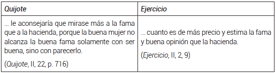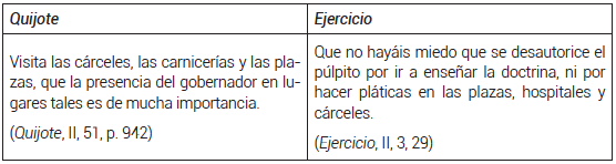Debido a algunos hallazgos intertextuales me he preguntado si es posible que Cervantes hubiera tenido acceso a una de las primeras ediciones del Ejercicio. El trabajo comparativo es el más importante para poder soportar cualquier tipo de suposiciones. Ciriaco Morón Arroyo comenta que la explicación de un texto pasa por la estructuración de la profundidad del mismo. Esto es: clasificar, contextualizar, explicar el fondo ideológico y atender al carácter artístico del texto. De alguna forma la comparación encaja en la contextualización, de la que Morón dirá que «algunos pasos ambiguos del Quijote se explican con paralelos de la misma obra, del resto de la obra de Cervantes, o con citas de sus contemporáneos, que nos ayudan a captar el sentido preciso de las palabras y expresiones»16. En esa línea de trabajo esta comparación tiene dos objetivos: poner en paralelo dos estructuras semánticas coetáneas y sugerir una posible influencia.