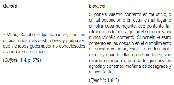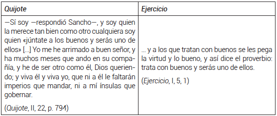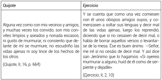 O este otro en que Sancho responde a un eclesiástico en el episodio de los duques y en donde rememora una enseñanza, que podría encontrarse en la Primera parte del Ejercicio.