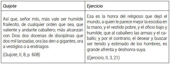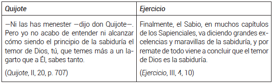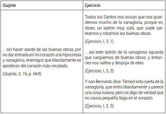 Otros intertextos muestran cómo Cervantes es capaz de realizar contrapuntos entre conceptos espirituales y chanzas coloquiales. En este Don Quijote habla con Sancho. El paralelo se encuentra en la Parte tercera del Ejercicio, dedicado a las virtudes propias de los miembros de la Compañía.