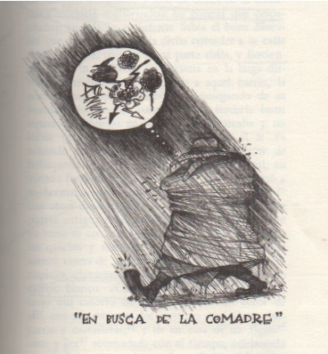 No nos cuesta imaginar y hasta oír los melindres de Mari Pérez y la pusilanimidad del marido que, al temer la reacción histérica de su esposa, sale precipitadamente a buscar a la comadre, no sin revestir previamente su ridícula camisa de fuerza, o armadura, para afrontar la tempestad: botas, capa aguadera, capilla y sombrero, a semejanza de un héroe de novelas de caballerías, capaz de superar todas las pruebas para satisfacer a su dama. Tal atuendo completo, que lo protege de los pies a la cabeza, no representa sino una forma de disfraz, o de enmascara-miento carnavalesco que lo transforma en el títere de una esposa regenta.