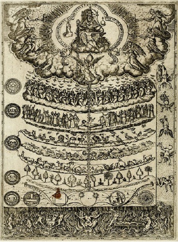 Por su parte, el cristianismo de la época organizaba los destinos de ultratumba en: Cielo, Infierno y Purgatorio (una zona intermedia de paso)28. La relación entre Cielo e Infierno se estructuraba en un eje vertical producto de la influencia de los clásicos y su visión de los cuatro elementos: fuego, tierra, agua y aire29. Como se representa en la Retórica cristiana de Diego de Valadés (figura 1), Cielo e Infierno se ubican en posiciones opuestas: al Cielo corresponde lo puro, ligero, espiritual y etéreo; en contraposición, lo vil, terrenal, grosero y pesado refiere al Infierno. El Diablo se encuentra en el inframundo debido a su pureza degradada y falta de perfección espiritual. Este es un espacio al que van a parar quienes, por el peso de sus pecados, cayeron en lo más vil y, por lo tanto, desecharon en vida buscar la pureza para ascender al paraíso; sus almas conservaban las facultades de entendimiento, voluntad y memoria, así como la capacidad de experimentar goce o sufrimiento, según su destino30. En el infierno, los castigos eran aplicados por los demonios, quienes siempre estaban interesados en arrebatarle las almas a Dios, aunque a veces también se creía que este castigaba a sus enemigos mediante el Infierno31. El sufrimiento se provocaba a través del fuego, aunque este solo servía para quemar y no para iluminar, ya que el Infierno se describía como un lugar de oscuridad, a veces frío y húmedo, por el que no penetraba ninguna luz, situado en las entrañas de la tierra, en una especie de cárcel. Cielo e Infierno son, desde la perspectiva cristiana, dos espacios distintos, experiencias post mortem diversas. Nuestro interés, ahora, se traslada a verificar qué elementos de la cosmografía cristiana Olmos traslada en su traducción del Mictlan y qué elementos ocupa dentro del imaginario indígena para hacerlo un lugar temible.