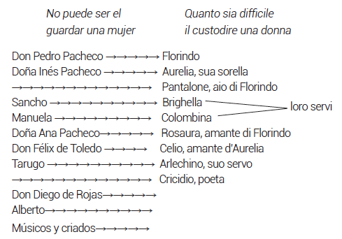 Se registra, además, la supresión de dos segundos galanes: don Diego de Rojas y Alberto. De la misma manera, hay que apuntar la presencia de dos personajes secundarios de nuevo cuño: Pantalone, ayo de Florindo, y Cricidio, poeta.