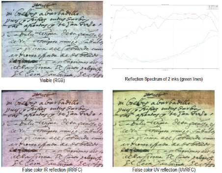 The analyses carried out infer that the results will vary depending on the composition of the inks. The multispectral technique will not offer additional information in cases in which the inks used have very similar characteristics. Consequently, it will not facilitate the reading of crossed-out passages in itinere or a posteriori corrections if the ink used is very similar to the original.