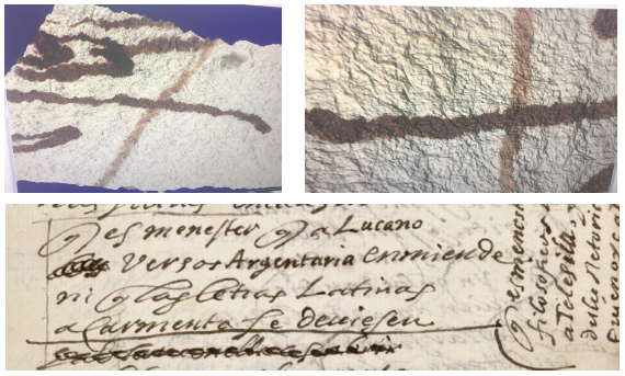 In this case, the point where the two lines —supposedly drawn by two different hands— meet was analysed with raking light. Everything points to the horizontal line seen in the reproduction of the manuscript being done by the hand of Lope de Vega, who included it to show the exact place where the passage from the right margin was to be inserted. It is possible that the vertical line seen on the left margin of the lines may have come from another hand —that of an autor de comedias— aimed at pointing out a passage that was to be eliminated from the performance. The purpose of analysing the crossing-point of these lines was to have evidence proving which of the two had been produced earlier. If the evidence were to reveal that the vertical line was made before the horizontal, then we could say that Lope de Vega corrected the manuscript after someone else intervened in it.