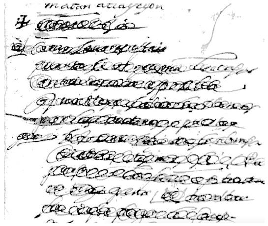 The goal of the analysing La niñez del padre Rojas manuscript with the VSC 8000 was to try to read the end of the second act, where more than 25 lines are com- pletely crossed out and nearly impossible to read. Although none of the techniques provided an optimal solution to the problem, in some places, the image captured in the spectrum band of 540 nanometres —subsequently modified using image filters (contrast, saturation and sharpness)— highlights the differences between the ink of the text (which generally appears more tenuous and greyish) and that of the cross- outs, which tends to be darker, thus facilitating the reading of some passages.