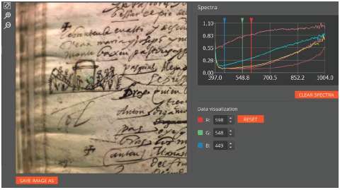 The X01 multispectral camera is small and spherical, about 25 centimetres in diameter and easy to transport15. Its technical characteristics include a wide-spectrum range (from 350 to 1200 nanometres) and it captures up to 30 spectrum bands. We used this instrument to analyse several manuscripts that presented different types of illegible passages. First, we examined a case of pages stuck together to find out whether it was possible to read the text that was hidden under another paper. To do this, we used Calderón de la Barca’s autograph El secreto a voces, since folio 57 recto has a sheet with lines stuck on top of the initial text.