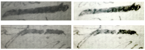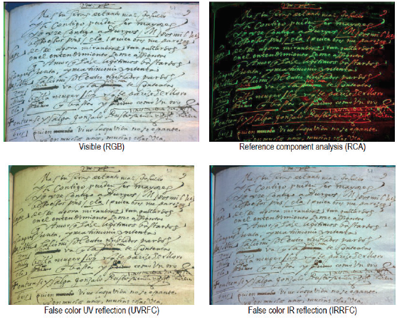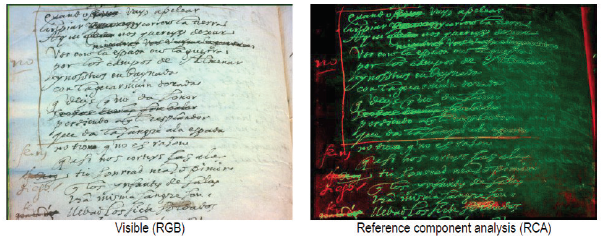 In this case, neither the image in the ultraviolet range or that in the infrared range area helped us read the deleted text. The Reference Component Analysis (RCA) —an approach to spectral deconvolution that makes it possible to separate two pigments and their mapping17— is also unable to distinguish between the inks used. It follows that the inks used to write the text and for cross-outs had very similar characteristics and therefore this technique does not allow them to be distinguished. The colours observed in the RCA —green and red tones— not indicate a difference in the composition of the inks, but rather relate to their thicknesses —i.e. they indicate the level of ink concentration.