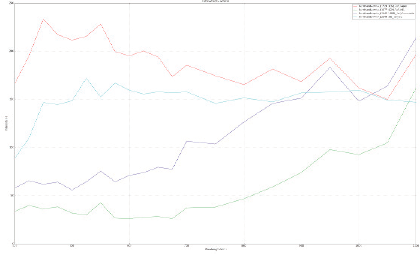 The reflection curves do not provide much more information. In the following chart, where the X-axis indicates wavelength and the Y-axis measures intensity (0-250), slight differences can be seen in the curves that mark the inks (green represents the original ink and dark blue represents the ink of the added passages), although only as regards their intensity, since their behaviours are virtually identical.