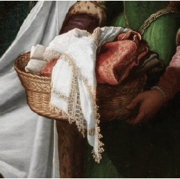 Respecto a la materia de elaboración de los pañales, se utilizaron lienzos finos de lino y algodón blanco (reservados para la nobleza), tales como holanda, ruan y bretaña, con guarniciones de bordados de nudillos37, vainicas, cortadillos38 y encajes de cadeneta y de bolillos, realizados con hilo portugués39 blanco y amarillo40, al modo de las randas representadas por Pantoja de la Cruz41 (figs. 12-13). Las mantillas abarcaron una gama cromática más amplia (blanco, azul, carmesí, pardo…), en géneros de diverso grosor como lana, grana, tafetán, raso y cotonía de Flandes, y decorándose con suntuosos ribetes de seda y briscadillo de oro y plata que delataban el rango social de su portador42.