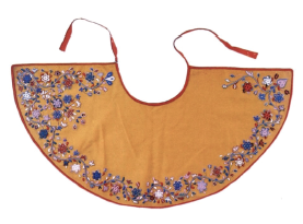 Excluyendo el sayo que vistió la infanta María Eugenia por razones de edad, los recién nacidos de la Casa de Habsburgo fueron bautizados con un conjunto de gala compuesto de manteo o faldellín de media capa (figs. 15-16) a juego con un amplio mantillo que, atendiendo a su color, podemos clasificar en relación a sus portadores. Un primer grupo y mayoritario, corresponde a tejidos blancos combinados con hilos de oro y plata o bordaduras de estos metales, en el que se encuentran la infanta Isabel Clara Eugenia (que fue obsequio de su madrina Juana de Austria), los hijos de Felipe III, y en el reinado siguiente, la infanta Margarita María Catalina, el príncipe Felipe Próspero y el infante Fernando Tomás. Un segundo grupo, de color azul, lo encarnan los príncipes Baltasar Carlos y Carlos II, y de forma excepcional Felipe III vistió de raso pardo, y su hermana, la infanta Catalina Micaela, de terciopelo carmesí con bordaduras de canutillo de oro, seguramente realizadas por Diego Ramírez, bordador de cámara de Isabel de Valois61.