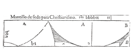 Por su parte, Juan de Alcega, en su Libro de geometría, práctica y traza, aporta el patrón de un manto de seda para cristianismo con forma de semicírculo imperfecto (ligeramente más largo en la falda trasera), ya que, tal y como nos explica: «no se tiene por falta ir un poco más largo por detrás, antes de opinión de muchos lo tienen por mejor»71 (figs. 18-19). Para concretar las dimensiones de su propuesta, hemos realizado los cálculos pertinentes siguiendo las indicaciones del propio sastre, quien establece un consumo necesario de seda de cuatro varas y dos tercias72 (BBBBTT = 3,90 metros). En la base del semicírculo se disponen dos secciones de una vara y una tercia cada una (BT = 83,59 cm + 27,86 cm = 1,11 metros; 1,11 x 2 = 2,22 metros), y para la altura de la figura (correspondiente a la falda trasera), se determinan dos secciones y un cuchillo o añadidura cuya suma equivale a una vara, una tercia y dos dedos; resultando 1,15 metros (BTII = 83,59 cm + 27,86 cm + 1,74 cm + 1,74 cm = 1,15 metros). Por tanto, puede afirmarse que Alcega recomendó dotar a estos mantillos ceremoniales de una longitud de falda trasera 4 centímetros mayor que los de uso ordinario.