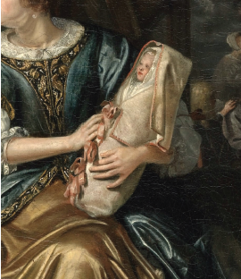 Por otra parte, en atención a las fuentes visuales, una de las particularidades de la dinastía Habsburgo fue no retratar a los pequeños infantes conmemorando su bautismo, con la salvedad de un controvertido lienzo atribuido a Martínez del Mazo, que Young identificó con Carlos II de Austria (fig. 17). Coincidiendo con los diferentes relatos coetáneos65, el príncipe aparece envuelto en un majestuoso manto azul bordado en plata y la cabeza cubierta con una rica capota de randas, siendo precisamente el detallismo de su atuendo el argumento técnico que el mencionado historiador adujo para atribuir la obra al pintor de cámara de Felipe IV: