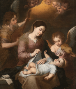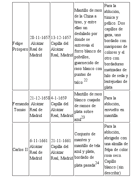 Junto al aparador, una cama-cortina de brocado servía de auxilio para que el aya, asistida de la azafata, ama y comadre, desvistiesen los indumentos de gala del recién nacido y los sustituyesen por las envolturas estipuladas para el rito del agua; que estaban compuestas por una sabanilla de holanda y una mantillla de grana blanca, además de una almilla interior de felpa si el bautismo era en invierno. En algunos casos, estas envolturas fueron dádivas pontificias; por ejemplo, en 1601 y 1626 para los bautismos de las infantas Ana y María Eugenia, las cuales fueron bendecidas por Clemente VIII y Urbano VIII y enviadas ad hoc a la corte española. En otras ocasiones, existieron variaciones a la generalidad de los infantes; como Carlos II, quien llevó una almilla de color rosa seco como reparo del frío, y el príncipe Felipe Próspero, que según las crónicas fue bautizado con una túnica y un pellico que inevitablemente nos traen al recuerdo el atuendo del Divino Infante de Murillo (fig. 20):