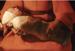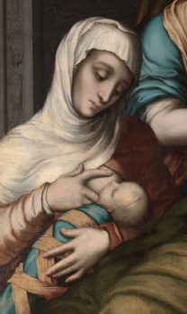 En Europa existieron dos métodos diferentes de disponer el fajero: enrollado en espiral (fig. 3), y ceñido mediante dos diagonales encontradas; en cuyo caso, era más visible la sabanilla con la que previamente se había envuelto al niño. Algunos autores (Carlos Varona22, Cenalmor Bruquetas23) señalan que, como rasgo de la cultura aurisecular, en los países mediterráneos tendió a usarse el primer método, mientras que en Europa septentrional (Francia, Inglaterra y Alemania), se optó por el segundo. Conforme a este último, cruzado en retícula, Luis de Morales representó la escena de El nacimiento de la Virgen (fig. 4), a la que le atribuyen la incorporación de dicha particularidad como consecuencia del contacto directo del pintor con artistas del norte de Europa. Sin embargo, son numerosas las muestras figurativas que evidencian la existencia de este sistema de fajado en la España medieval, entre otras, la tabla de La Natividad de Santa María de Aviá (fig. 5) o el retablo de la catedral de Manresa, obra del pintor catalán Pedro Serra. Además, en la corte de Enrique VIII de Inglaterra, entre los preparativos que se hicieron en 1514 para el cuarto parto de Catalina de Aragón, fueron confeccionados seis fajeros especialmente anchos (2,70 x 0,33 metros)24; lo que demuestra que estaban pensados para disponerse en espiral.