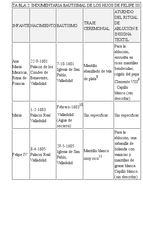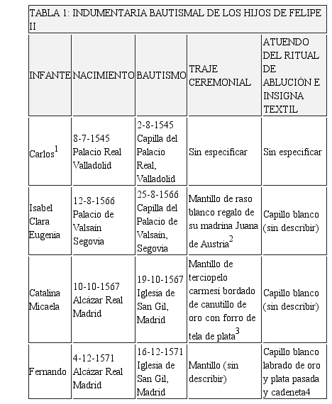 Tras la ablución y la unción del crisma se procedía a la imposición del capillo, con el que, simbólicamente, el niño era revestido de Cristo quedando unido a él. Esta insignia textil, sustituta de la primitiva alba, ya fue utilizada en tiempos de la dinastía Trastámara75, con la cual se fueron gestando unos usos concretos en los rituales de bautismo en los que, aunque con cierta sencillez protocolaria, se confirió especial consideración a los objetos suntuarios76.