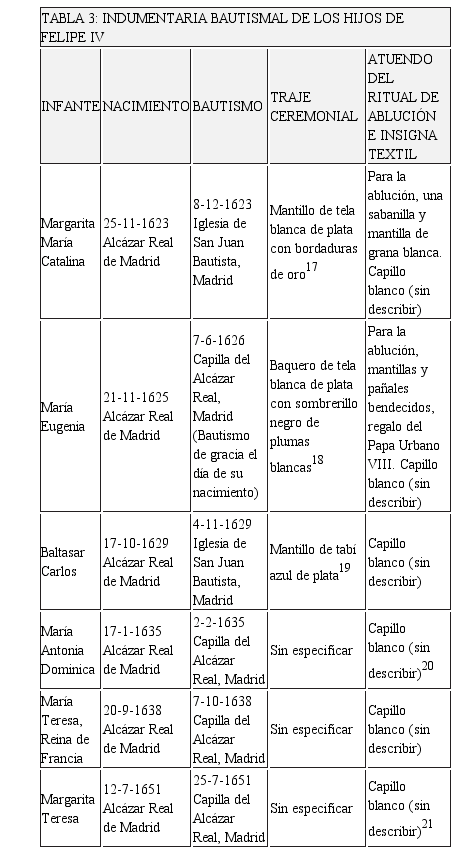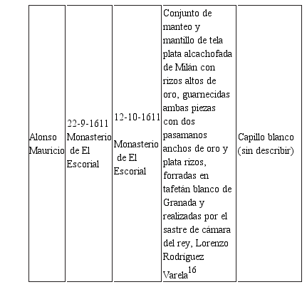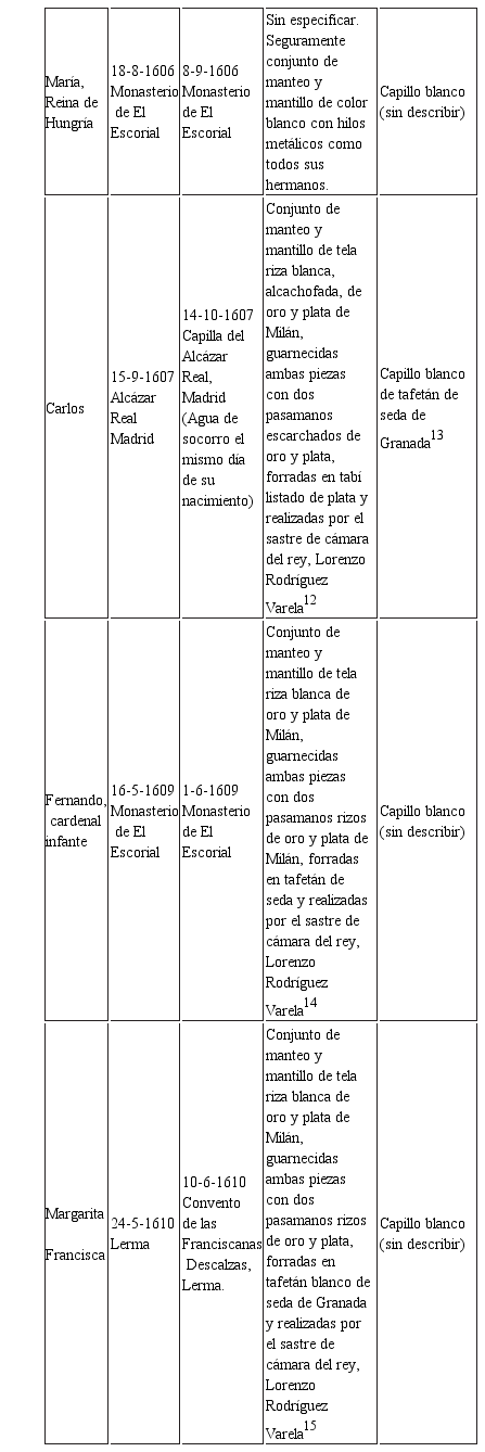 La pompa ceremonial que requerían los bautismos regios implicaba que el conjunto de manteo y mantillo, especialmente dispuesto para este fin, estuviese dotado de mayor riqueza de tejidos y guarniciones que los de uso ordinario. Las cuentas relativas a los indumentos confeccionados con motivo del nacimiento y bautismo de los cuatro hijos menores de Felipe III y Margarita de Austria (Carlos, Fernando, Margarita y Alonso), indican que para cada uno de ellos el sastre de cámara del rey, Lorenzo Rodríguez Varela62, realizó su respectivo traje de cristianar, además de dos mantillos ordinarios de raso; uno blanco y otro azul, ambos ribeteados con dos pasamanos de oro y plata y forrados en tafetán de seda de los mismos colores.