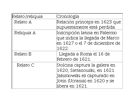 a) Relato alternativo A. Polczynski en «A Polish Slave’s Escape from an Ottoman Galley». Según este historiador, existiría un ejemplar del mismo evento en 1623 titulado La conquista della galera di Alessandria nel porto di Metelline, coll’opera e gran coraggio del Capitano Marco Jakimowski Polacco, lo que haría tambalear las coordenadas históricas y editoriales. «As no original copy of the 1623 publication has survived, it remains unclear whether the mutiny occurred»36. Ante esta nueva perspectiva y siguiendo esta tesis, el acontecimiento habría sucedido antes y relato habría aparecido uno o dos años después, para reimprimirse cinco años más tarde en Roma, pero no lo sabemos con seguridad y por eso las referencias temporales resultan tan confusas. No sabemos, por tanto, si el evento se produjo antes de 1623 o en 1627.