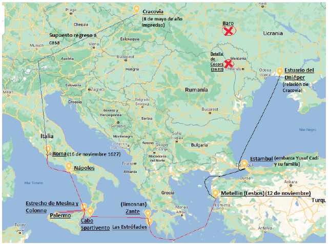 La narración detalla los sucesos que tienen lugar en el viaje desde Mitilene (Lesbos) a Cracovia (República de las Dos Naciones). En el siguiente mapa resumimos la supuesta trayectoria de Kassimbech (con una línea negra) y luego la de Jakimowski tras su liberación (con una línea roja) y su regreso a Cracovia (con una línea azul), siempre considerando el testimonio romano. También hemos añadido tres localizaciones que nos parecen esenciales: Baro (lugar de nacimiento de Jakimowski), Cécora (territorio de frontera donde se produjo en 1620 la derrota polaca frente a la incursión de los crimeanos) y el propio estuario del Dniéper, donde suponemos, o al menos cerca de este, que se pudo producir la incursión de los cosacos reprimida por Mehmet antes de dirigirse a Constantinopla12: