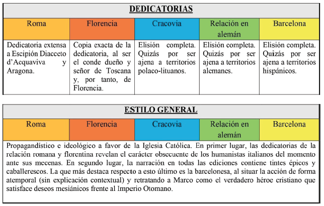 Los resultados contrastan mucho con lo indicado por la relación de Marnavitio y sus traducciones (florentina, polaca y alemana), por no comentar la barcelonesa, que destaca sobre estas mismas con un cronotopo totalmente diferente y contradictorio. Además, una de las consecuencias de aceptar los relatos C, D o E sería también que Marco habría sido recibido por el papa Pablo III y no por Urbano VIII, que comienza su actividad en 1623.