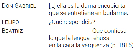 Y para llevar a cabo su propósito, Beatriz sabe que es fundamental el secreto, recurso literario secular, que atiende aquí su aspecto decoroso procedente de las reglas del amor cortés de perspectiva masculina (ocultar una relación amorosa, guardar el nombre de la dama12) y el dramático desde la femenina de Beatriz (salvaguardar su opinión, vida, amor)… que se hace evidente en las actuaciones de estas audaces damas, que no pueden ni deben comunicar ni confiar su pasión a nadie13. Pero este secreto es frágil y suele presentar fisuras para apoyar el desarrollo del enredo y potenciar la tensión dramática chocando con la necesidad de comunicación e información de los otros personajes (que indagarán, intrigarán, revelarán, espiarán… para la consecución de sus intereses). Secreto impuesto por Beatriz que precisamente será la que por un descuido propicie su ruptura y por tanto su propagación y complicación de la trama, para menoscabo de don Gabriel, a quien se acusará de hablador.