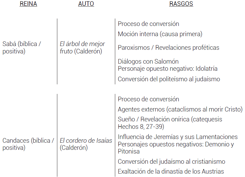 En estos tres autos calderonianos, el personaje de la reina, caracterizado de inicio por su inquietud intelectual y trascendental, se presenta como sujeto de una conversión espiritual basada en un esquema de gran efectividad dramática y escénica: una moción interior o una inquietud impulsada por hechos externos de cariz religioso; la pérdida de conciencia a través del paroxismo o del sueño; la revelación o auxilio divinos en esa situación de trance profético u onírico; la oposición de personajes pérfidos; finalmente, el abrazo de la nueva fe por parte de la soberana. No es infrecuente, asimismo, la introducción en algún punto de este esquema de los diálogos con otras figuras (Salomón) o con libros (de Jeremías y san Agustín), lo que supone un definitivo impulso en el proceso de conversión.