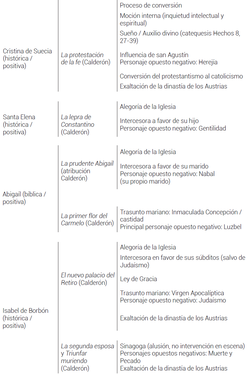 Las reinas bíblicas Sabá y Candaces, en El árbol de mejor fruto (1677) y El cordero de Isaías (1681), respectivamente, y la histórica Cristina de Suecia, en La protestación de la fe (1656), emergen como personajes regios femeninos que protagonizan un proceso de inquietud espiritual y de conversión en el que pueden rastrearse importantes similitudes.