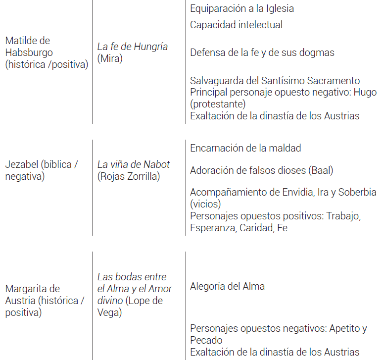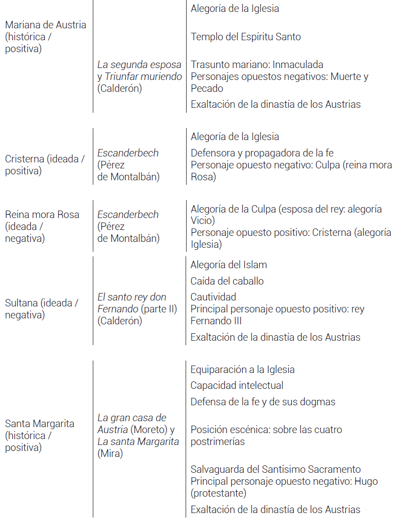 En este contexto, la reina, esposa del vicario de Dios en la tierra, emerge como un personaje especialmente funcional: a través de ella, debido a su asociación tradicional a la piedad y la oración, se la puede presentar como sujeto de un proceso de evolución espiritual impulsado por mociones internas, sucesos externos y escritos bíblicos y de los santos padres. Asimismo, gracias a la tradición veterotestamentaria de la unión conyugal entre Dios y su pueblo, así como al concepto espiritual de los desposorios místicos, la figura de la soberana encaja inmejorablemente como alegoría positiva, entre otras, de la Iglesia y el Alma, y de sus correspondientes contramodelos: por ejemplo, alegoría negativa de religiones opuestas a la verdadera (alegoría del Islam) o alegoría contraria a la pureza y candidez del alma (alegoría de la Culpa). Por último, la equiparación de la reina con la Virgen María responde a la presentación secular de esta como modelo ideal de la mujer, al que debe aspirar, tanto más que ninguna, la soberana.