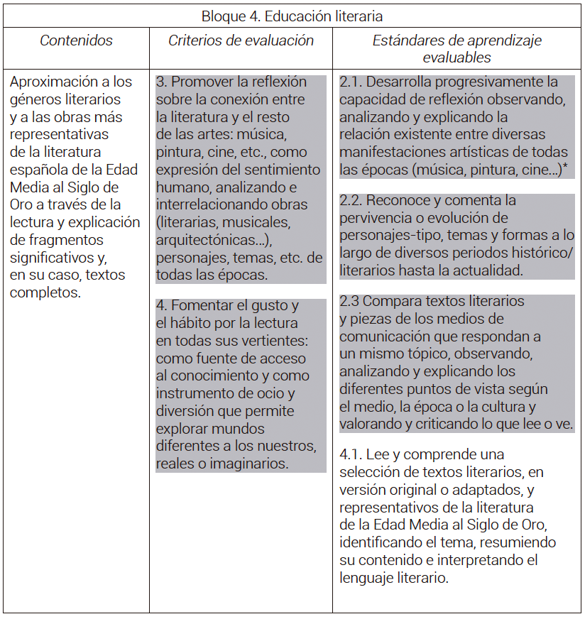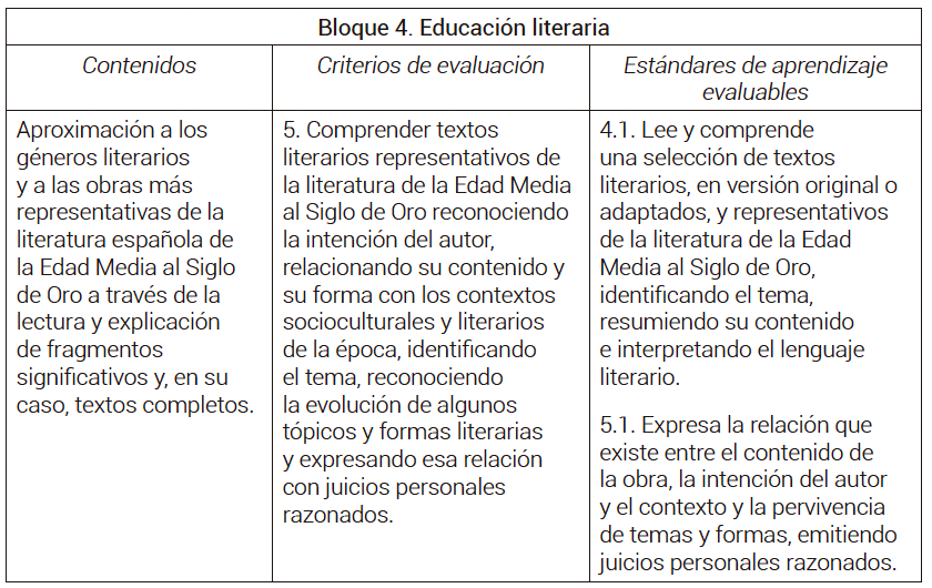 La literatura española del Siglo de Oro, según el Real Decreto 1105/2014 que regula las enseñanzas de la Educación Secundaria Obligatoria para la asignatura de Lengua castellana y literatura se imparte en el primer ciclo, correspondiente a los cursos 1.º-3.º. En concreto, los contenidos, criterios de evaluación y estándares de aprendizaje1 que se refieren a este periodo de la literatura son los siguientes: