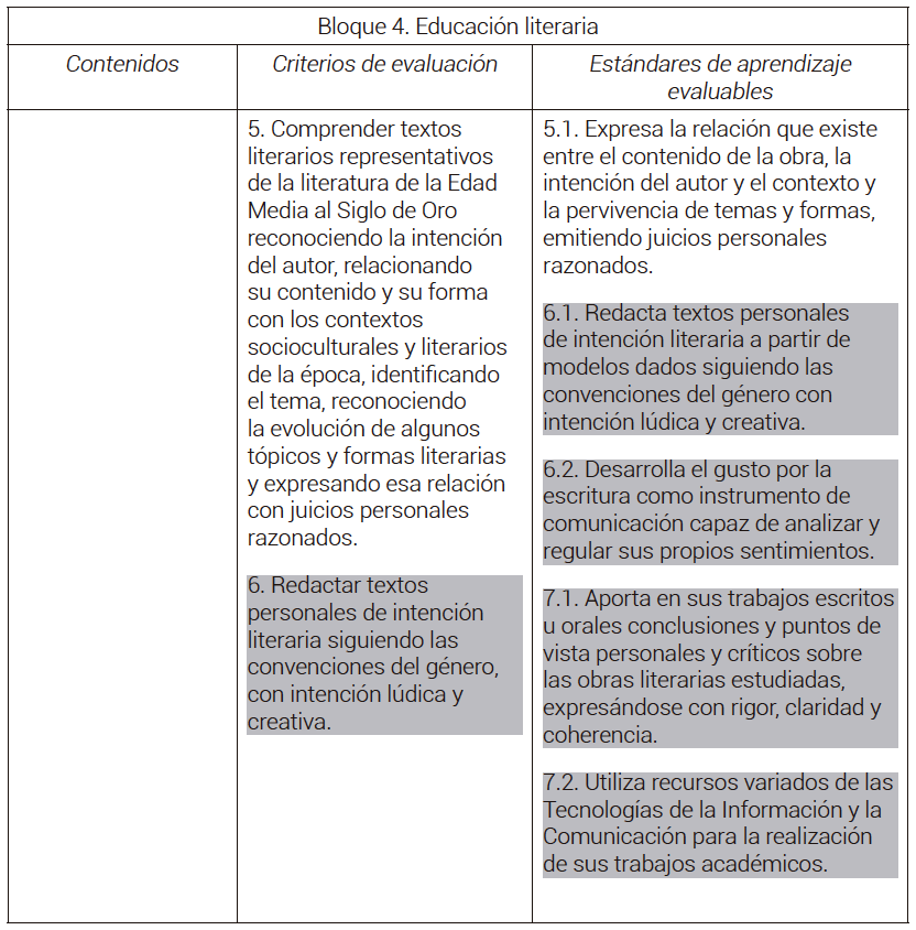De esta realidad educativa nace esta propuesta de actividades, con la modesta intención de ofrecer una serie de textos y cuestiones a partir de las que poder trabajar la literatura virreinal en el aula de Secundaria. Las obras y autores se han articulado en torno a los tres grandes géneros tradicionales: prosa, poesía y teatro. En cada uno de ellos se ha procurado trabajar un aspecto diferente de la lengua, y la literatura, además de valores cívicos (tolerancia, igualdad), relación con otras artes (pintura, literatura comparada), al igual que competencias como la expresión oral y escrita, el manejo de las TIC (redes sociales), etc. Asimismo, dentro de la literatura virreinal se han integrado piezas de literatura escrita por mujeres. En consecuencia, el conjunto de ejercicios didácticos que aquí se ofrecen pretende acercarse más a los contenidos, criterios de evaluación y estándares de aprendizaje recogidos en el Real Decreto de 2015. No se trata de una secuencia de actividades completa, sino de una suerte de guía de textos y actividades de índole transversal que deberán profundizarse y complementarse por el docente dependiendo de características específicas del aula como el tiempo, el nivel de conocimiento de los alumnos de la materia, las dificultades que puedan encontrar, etc. En la siguiente tabla, se muestran en blanco los aplicados por los libros de texto en su mayoría y en gris los que pueden alcanzarse mediante la implementación del tipo de actividades aquí planteadas.