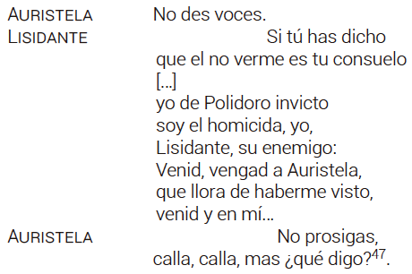 Tras este momento de reunión, la Auristela del Persiles se muestra amorosa, mientras que la calderoniana permanece altiva hasta el final de la escena: en efecto, se sucede un diálogo de amor y despecho, en el que la dama actúa como fiscal; pero cuando el galán se acusa no quiere que sea descubierto.