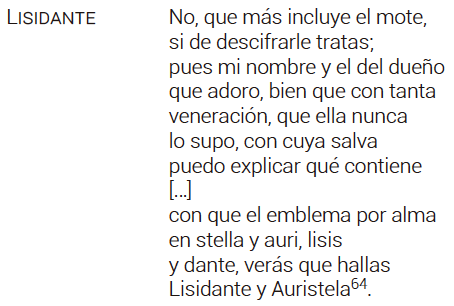 La anagnórisis final hermana de nuevo a ambos personajes, pero mientras la Auristela cervantina queda convertida en otra persona (o, por mejor decirlo, se revela su identidad al final de la obra, que en eso consiste el recurso aristotélico), en el caso de Calderón es Lisidante quien cobra una nueva identidad, pero en función de su amada. Es entonces el propio nombre de Auristela el que salva a su amado Lisidante, por medio de la explicación del emblema y el mote que hay en su escudo: