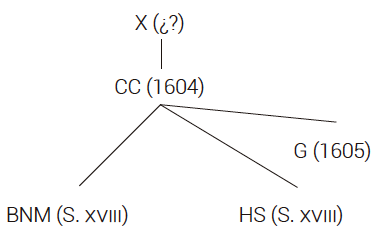 Aparte de este último apógrafo (G), tenemos dos otras copias del siglo XVIII, localizables en la Biblioteca Nacional de España (BNM) y en la Hispanic Society of America (HS), que son traslados fidedignos del manuscrito de la Biblioteca Capitular (CC) adecuados a las grafías de su época. En definitiva, si tenemos en cuenta todos los códices citados, el stemma7 de la obra que vamos a analizar, sería el siguiente: