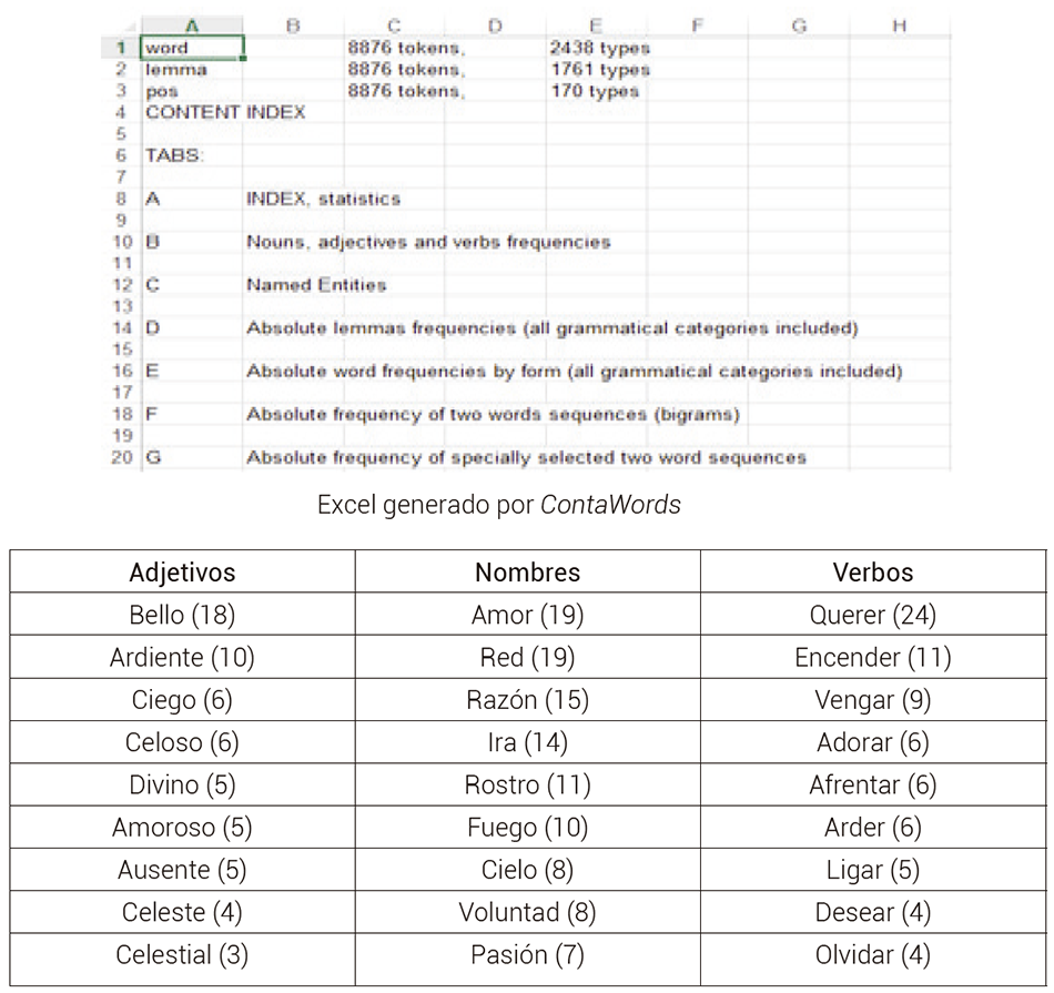 Por tanto, la estudiosa buscó trazar redes léxicas de contenido en las obras de dos poetas representativos del Renacimiento español para analizar la proximidad semántica existente entre los emuladores hispanos y el precursor del modelo, lo cual vamos a llevar cabo en unos instantes, pero tomando como referencia la fábula de Los amores de Marte de Juan de la Cueva. En consecuencia, usaremos principalmente un programa llamado ContaWords61, capaz de detectar las diferentes categorías gramaticales de un texto y de mostrar el número total de apariciones de las palabras con escrupulosa precisión, como indica Javier Blasco Pascual: «Cuando le encargas una tarea, lo primero que hace ContaWords es leer las palabras de un archivo de texto y decidir qué categoría gramatical tiene cada una para luego asignarle su lema» (Estilometría). Una vez introducido el texto de la fábula mitológica en la aplicación, obtenemos los resultados visibles en el Excel y en la tabla: