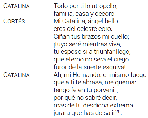 Por otro lado, encontramos en la obra el marco historiográfico y épico, pues su protagonista es un Hernán Cortés joven que está predestinado a un futuro como héroe y conquistador. Este trasfondo histórico trae aparejado el hecho de que Escosura al final de la obra deba ser fiel a la verdad histórica y tenga que casar a Hernán Cortés con Catalina y presentar, en los momentos finales del texto dramático, al personaje del Conquistador a punto de partir para iniciar sus gestas. La obra plantea, en definitiva, un doble final. Por un lado, la boda concluye la trama amorosa y resuelve el lance de honor, pero, por otro lado, el asunto histórico no puede finalizarse libremente y por eso el dramaturgo debe mostrar al personaje de Cortés en los momentos últimos de la comedia asumiendo su inevitable destino como conquistador.