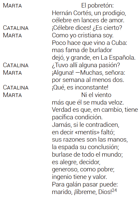 Aparece asimismo el gracioso, en este caso Chacón, criado de Hernán Cortés y finalmente, se presenta el propio Cortés. Estos dos últimos personajes entran en la casa de doña Catalina con el fin de que el galán inicie el cortejo de la dama. Después del diálogo entre los enamorados, el conflicto se plantea con la irrupción en escena del pretendiente viejo, el Adelantado, del que Hernán Cortés es secretario y al que se enfrenta en ese momento de modo altanero. A punto de batirse en duelo ambos personajes, son interrumpidos por la llegada del hermano de Catalina, que apoya a Velázquez blandiendo también su espada contra Cortés, quien finalmente logra escapar tras vencer a sus dos contendientes.