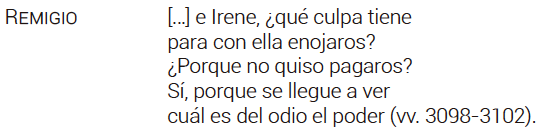 Resulta interesante observar el desenlace de los arrancas pasionales de ambos personajes al ver frustrados sus deseos. Por un lado, Britaldo afirma estar solícito a abandonar el amor por Irene bajo la condición de que ningún hombre consiga de ella lo que él no pudo: «Que ninguno otro lograra / lo que yo no puedo, fuera / de celos aqueste llaga / peor que la del amor» (vv. 2717-2720). Una especio de “perro del hortelano” que, pese a no disfrutar de su objeto de deseo, clama una autoridad sobre él. No obstante, como observamos después, al enterarse de que dicha promesa ha sido rota —cree que Irene ha cedido al amor de otro al creerla embarazada—, decide vengarse de Irene haciéndola asesinar. Por otro lado, cuando Remigio se sabe desairado por Irene, una fuerza irracional se apodera de él y crea un ardid para perjudicar a Irene mediante una infusión de hierbas que simulan los síntomas del embarazo: