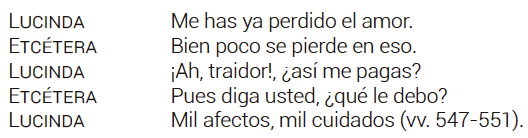 La inversión del orden social llevada a cabo por los graciosos resulta conveniente para poner en perspectiva las acciones de los amos pues, como señala Mikhael Bajtín, la carnavalización en materia literaria es un término cargado de contenido político: «En el carnaval se elabora, en una forma sensorialmente concreta y vivida entre realidad y juego, un nuevo modo de relaciones entre toda la gente que se opone a las relaciones jerárquicas y todopoderosas de la vida cotidiana»23. En ese sentido, los graciosos son claramente elementos carnavalescos pues ofrecen una mirada alternativa a los discursos dominantes en el ámbito señorial. Ahora bien, la carnavalización de los graciosos, como discurso alternativo, parodia la vida cotidiana de los amos, pero no busca anularla del todo, sino plantear «una negación que simultáneamente resucita o renueva aquello mismo que niega. Lo resucita y lo renueva, pero también lo trastoca»24. Por ello, la dinámica amorosa entre Etcétera y Lucinda no transgrede el marco patriarcal en el que se emplazan los discursos amorosos de los amos, sino que los comenta y hasta cierto punto los critica al proponer fórmulas alternativas para las relaciones amorosas.