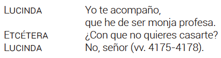 A medida que avanza la obra, el juego amoroso entre Etcétera y Lucinda se vuelve a invertir. Cuando Irene es asesinada y la verdad sobre su inocencia es develada, el gracioso, tal vez inspirado por la bondad ejemplar de Irene, le propone matrimonio a Lucinda. Sin embargo, la criada lo rechaza y decide acompañar a su señora Rosimunda al convento en el que desea confinarse: