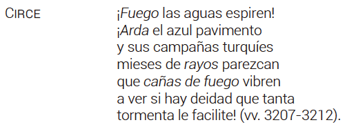 La caracterización de la isla de Circe, a quien se le llama «diosa de estos desiertos» (v. 184) que se nos dibuja sobre todo al principio, se nutre de léxico que insiste en su condición animal y terrestre: «Tierra ensaña la cima de aquel monte / Corona de esta sierra» (v. 30), «robustas fieras» (v. 70), «copas rústicas» (v. 71), «funestos ramos» (v. 72), «encantado monte» (117), «encantada selva» (v. 2825). En este sentido resultan también significantes las palabras de amor que Arsidas dedica a la maga: «estos montes por sólo mirarte vivo / […] / de tus encantos libre estos campos asisto» (vv. 943-950). Del mismo modo, la caricaturización de la Circe calderoniana se teje con elementos relativos al Fuego27. Aunque el hecho de ser hija del Sol ya en la mitología propicie esta caracterización, Calderón la pinta con vocablos de fuego. En boca de Antiestes: «Detrás de todas venía / bien como el dorado Febo / acompañado de estrellas / y cercado de luceros / una mujer tan hermosa» (vv. 178-181). Y en la de Ulises: «Bellísima cazadora / que en este opaco horizonte / siendo noche todo el monte / todo el monte haces aurora / pues no amaneció hasta ahora / que te vi la luz en él» (vv. 431-436). También ella misma se dice hija de una «luminar antorcha» (v. 596). Más adelante y ya víctima del encantamiento, Ulises se refiere a ella como «rosicler» (v. 1452) y «sol de quien fui girasol» (v. 1450).