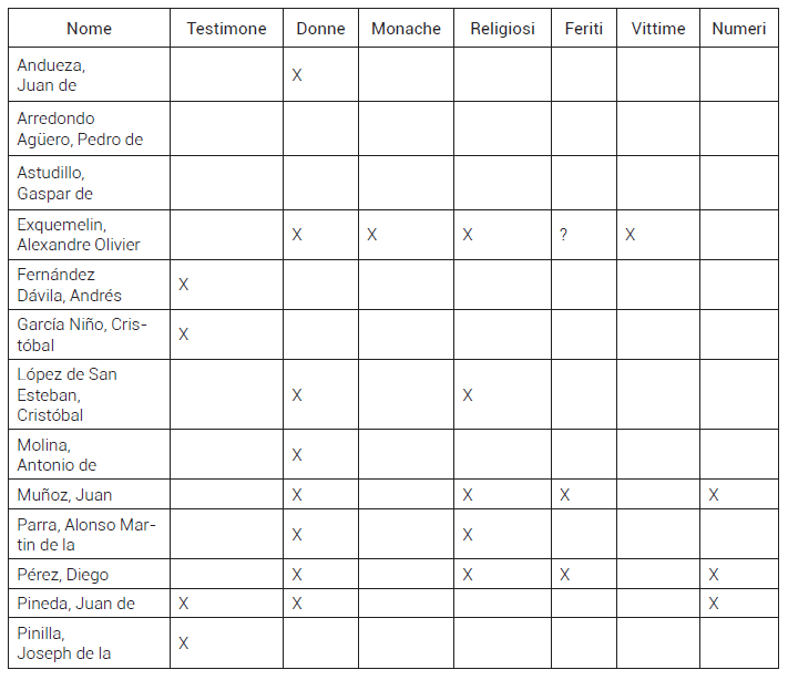 Infine, lo stesso Pineda aggiunse dei dati numerici: «portarono il qui presente testimone con altri otto o nove prigionieri davanti alla porta del castello al fine di trincerarsi dietro di loro mentre appiccavano il fuoco alla porta […] tanto donne come uomini»27. Per ultimo, un testimone inglese il cui nome venne storpiato in Roberto Uorni affermò che nel corso delle trattative successive, volte a garantire la restituzione della città alle autorità panamensi, gli intermediari erano accompagnati dagli ostaggi, ovvero «tutti i prigionieri, uomini e donne oltre al giudice [sic.] Don Pedro de Arredondo, Don Antonio de la Gama, oltre a chierici e frati e Don José de la Vega». È evidente che neanche in questo caso si fece riferimento alla presenza di religiose; in generale, nessuno affermò che i civili ebbero un ruolo attivo nell’assalto28.
