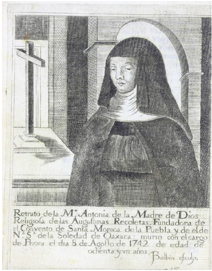 Sor Antonia de la Madre de Dios fue agustina recoleta, primero en el convento de Santa Mónica de Puebla de los Ángeles, y más tarde en el de Nuestra Señora de la Soledad en la ciudad de Antequera en el valle de Oaxaca. El último de sus confesores redacta la vida tras su fallecimiento, siguiendo el esquema convencional de esta tradición de escritura. Las dedicatorias que abren el volumen insisten en el arraigo de la venerable en una geografía concreta, que no es solo la de la ciudad de México o la de Puebla, grandes territorios de la religiosidad criolla, sino que se extiende a «provincias» como prueba de la enorme expansión de la santidad en tierras novohispanas: «El nuevo favor que hiciste con tu milagrosa aparición al patrio suelo de Antequera»15.